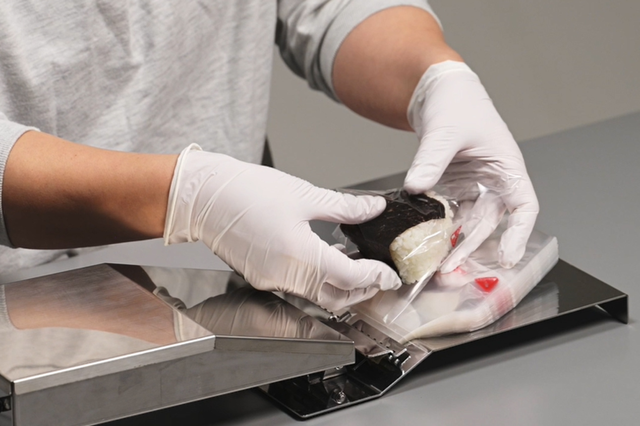 当社が新開発した「パン袋送風機」は、袋をセットするだけで風の力でパッと開口。パン袋はもちろん、入れにくいサンドイッチ袋やおにぎり袋も、瞬時に梱包可能な状態にします。